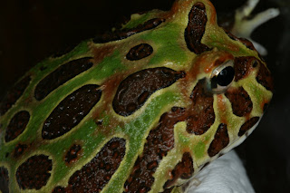 s in South America. These frogs are large, fat blobs with huge mouths. Often seen in the pet trade they are popularly known as "pac-man frogs" due to their characteristic "all-mouth" morphology (see photo of juvenile Ceratophrys ornata right). Ceratophryine frogs are sit-and-wait predators who sit on the forest floor camouflaged int he leaf litter waiting for large insects, or even small mammals to walk by. It seems that like the Boas the Ceratophryine frogs have, or once had, cousins from Madagascar.